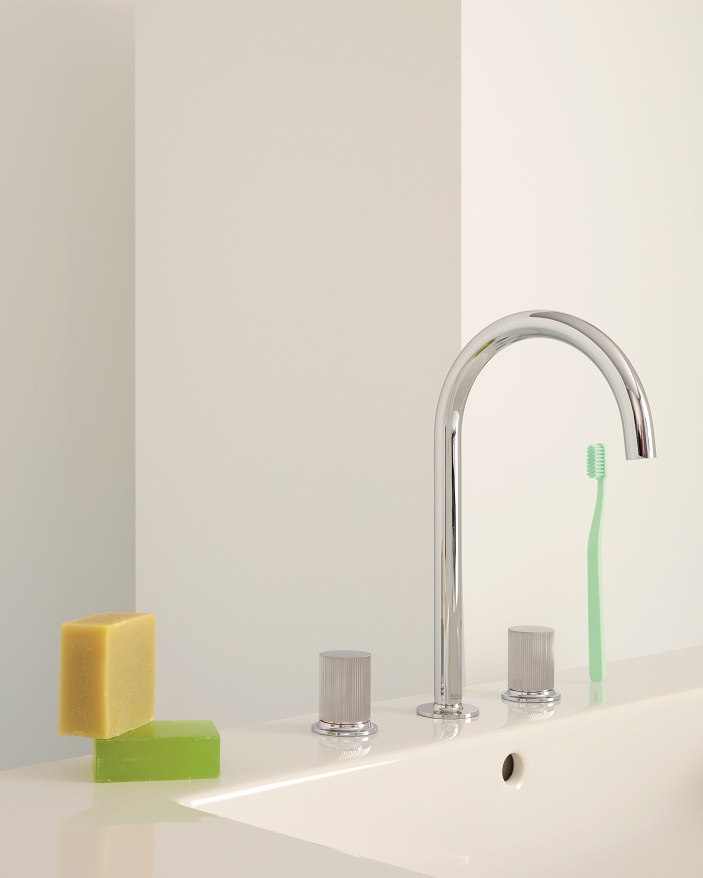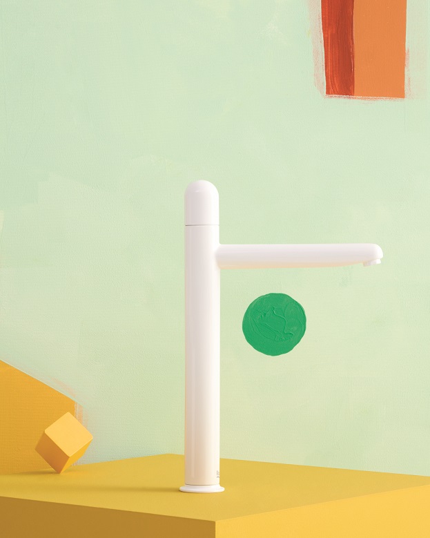 Nu koleksiyonundaki armatürlerin detayları, koleksiyonun benzersizliğini yansıtıyor. Kumanda kollarının alt bölümüne zarifçe yerleştirilen soğuk ve sıcak suyu belirten kırmızı ve mavi noktalar, kullanım sırasında gülen yüz şeklini oluşturuyor. Bu ince detay, günlük rutinlere eğlence katarken aynı zamanda hayal gücünü de besliyor.